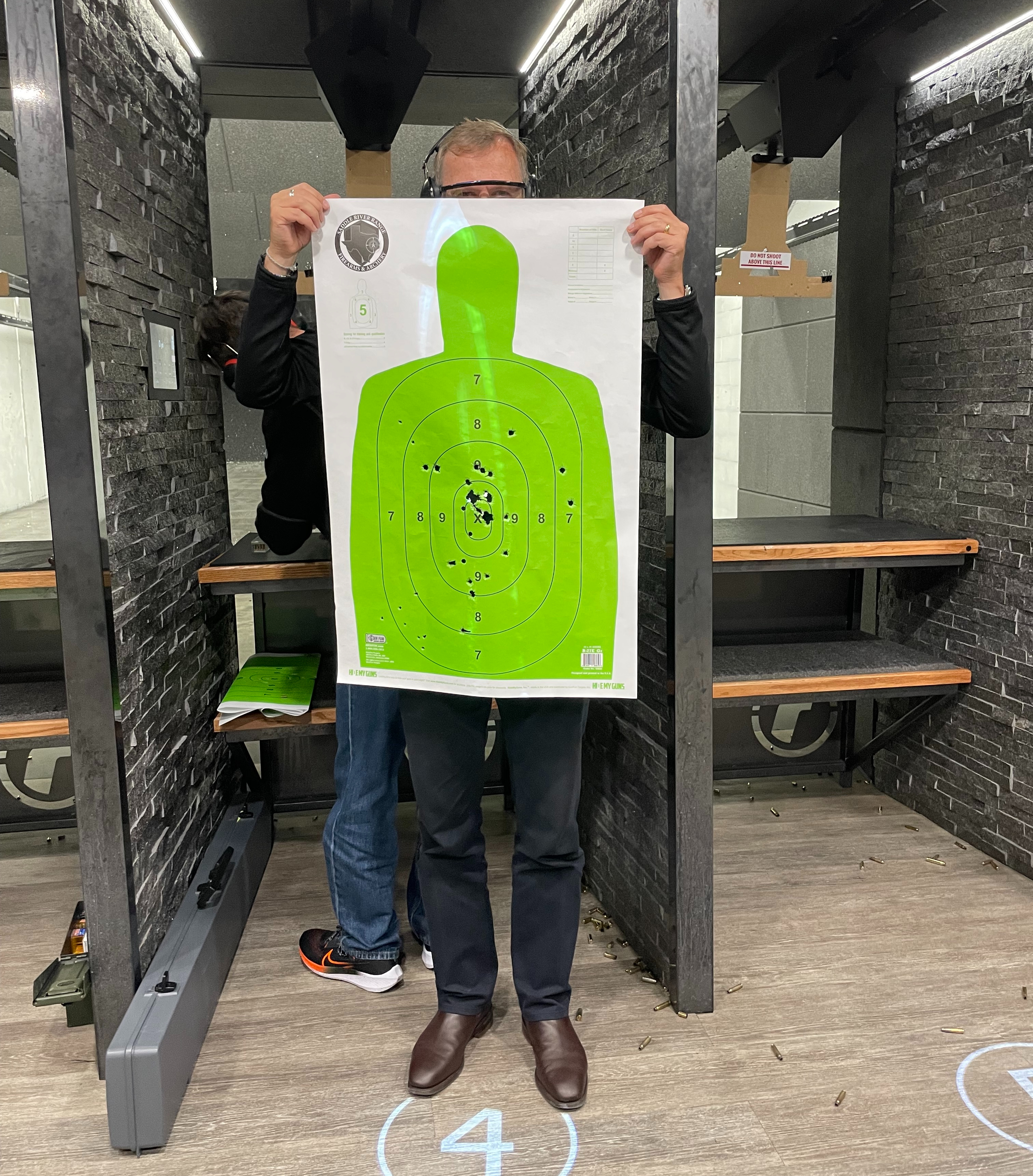 We had another outing in an indoor range with handguns using paper targets. The least encouraging part of this experience was the bleeding control kit on the side of the indoor shooting range!