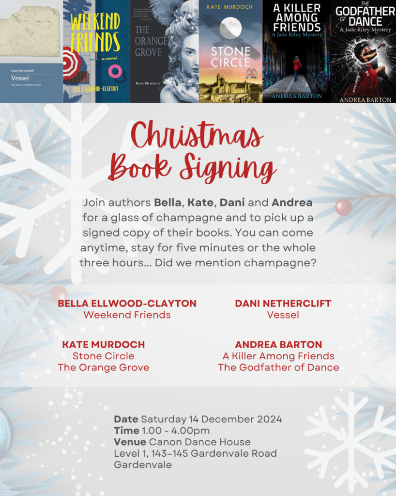 Join Bella Ellwood-Clayton, Kate Murdoch, Dani Netherclift and Andrea Barton for a glass of champagne and to pick up a signed copy of their books. No speeches. No fuss. You can come at any time, and stay for five minutes, or the whole three hours.