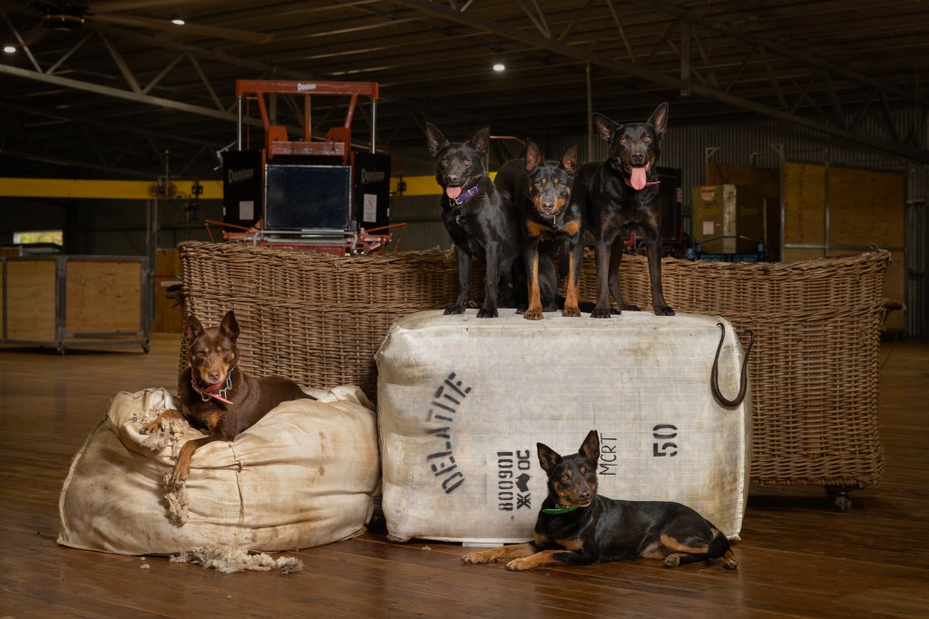 We then headed to the old shed and used an elevated doorway to photograph five of the seven dogs. With the dogs elevated and the distraction of sheep removed, the shot came together very quickly. Confidence back, I upped the stakes and tried my other idea for a group portrait – studio lighting inside the new shearing shed. I dragged my gear up the stairs, positioned wool bales and bins and did a quick lighting test before Amelia worked her magic. We had all five looking like they were born to be models.