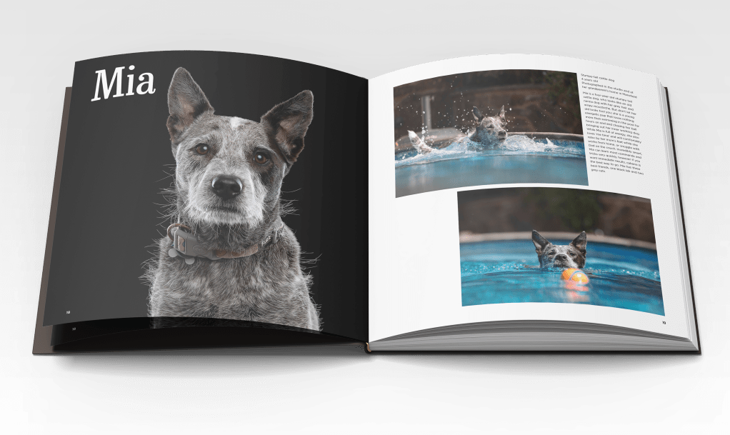 Book design started well before the sessions finished, with owners viewing the photos and helping to short list the images to appear in the book. They also supplied a written description to accompany their images. Their brief was to tell readers a bit about their dog and what they meant to them – to write as much or as little as they liked and there was no right or wrong way to complete the task. This resulted in a wonderful insight into the personalities of the dogs and their owners. There are some incredible wordsmiths amongst them!